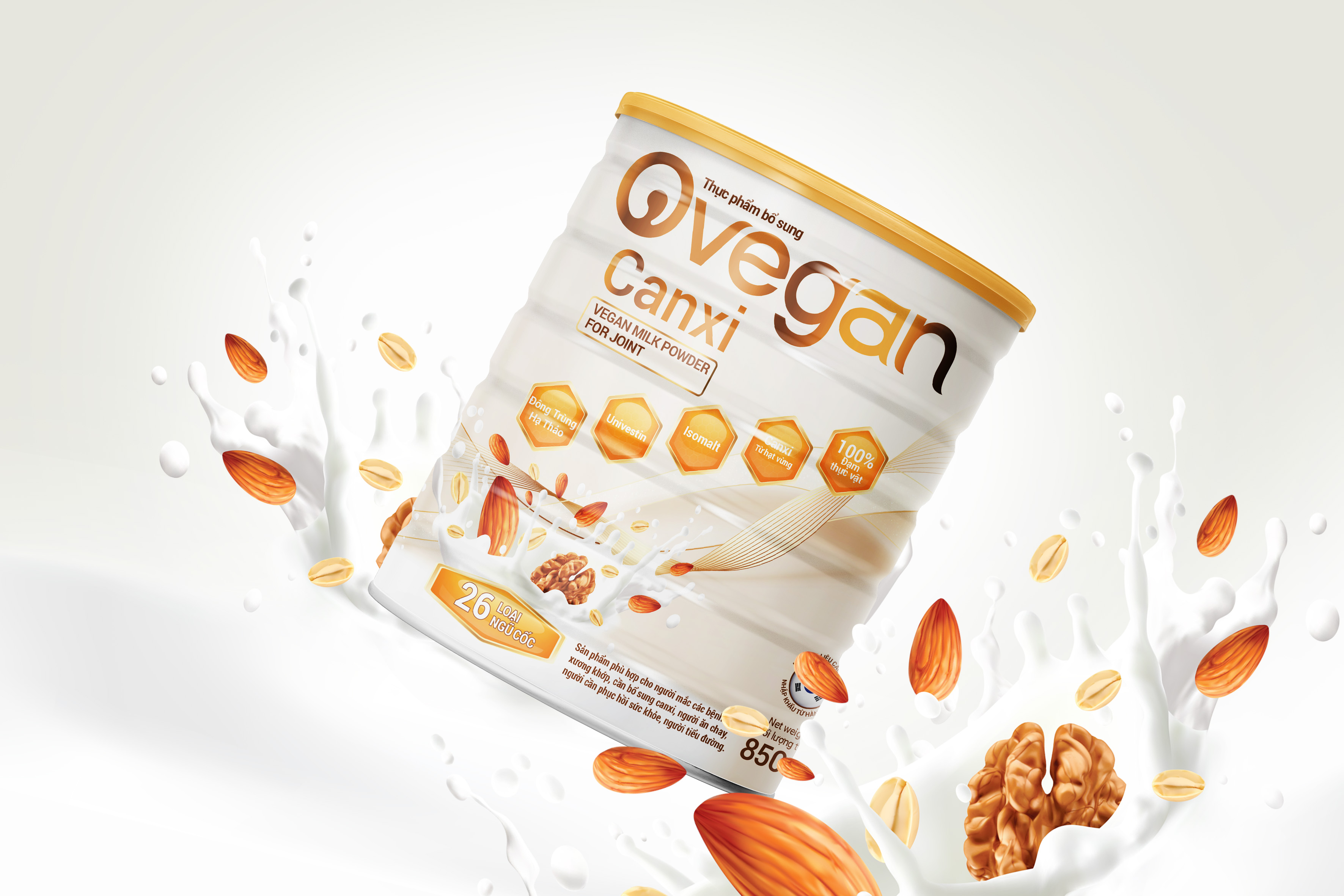 Ở lớp thông tin cuối, con số 26 loại ngũ cốc cùng hình ảnh hạt hạnh nhân, óc chó và dòng sữa chảy được đưa vào nhằm giảm bớt cảm giác “thực phẩm chức năng”, hướng sản phẩm về trải nghiệm tiêu dùng gần gũi hơn.