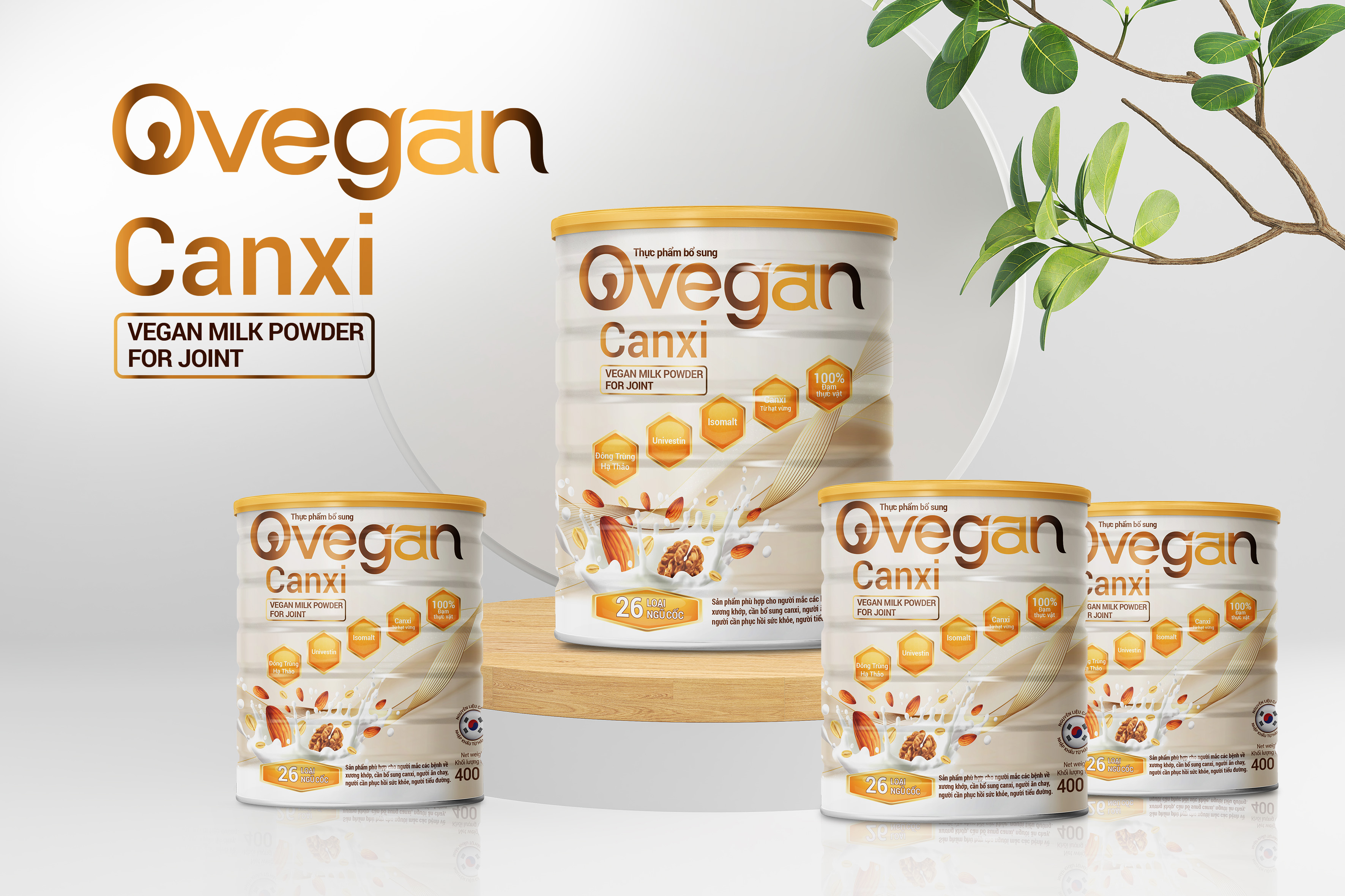 Dù sử dụng lon thiếc — vật liệu phổ biến để bảo quản bột sữa — thiết kế vẫn duy trì được tinh thần thân thiện với thiên nhiên thông qua bảng màu và hình ảnh lá cây ở nền. Sự kết hợp này giúp bao bì sữa hạt Ovegan giữ được kết nối với triết lý Vegan, mà không cần thay đổi cấu trúc bao bì truyền thống.