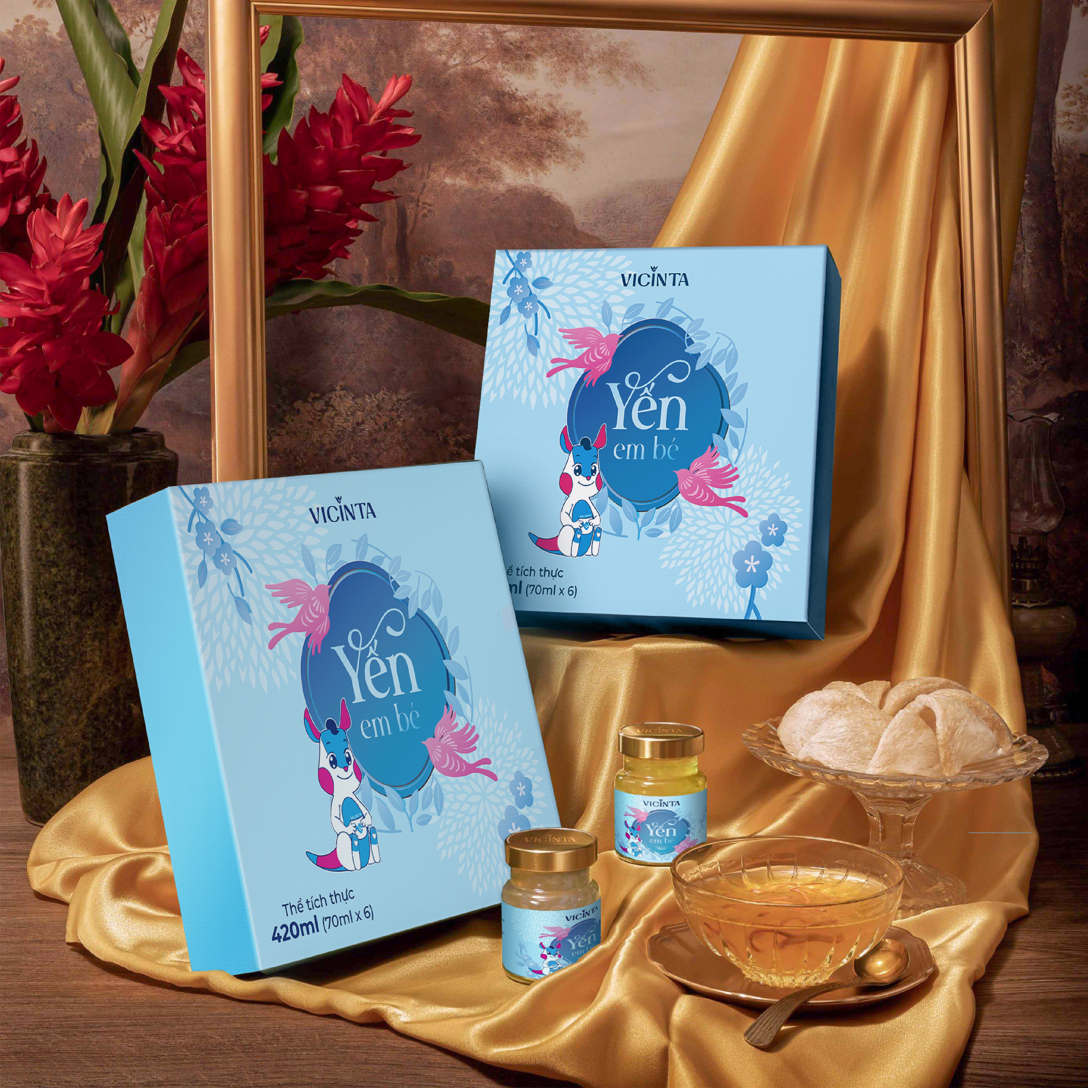 Hình ảnh tổ yến và nước yến thật được đặt cạnh sản phẩm như một lời gợi nhắc trực quan về nguồn gốc tự nhiên. Không phô trương, không cầu kỳ, chi tiết này giúp mẫu bao bì yến truyền tải giá trị cốt lõi của sản phẩm một cách chân thành, đủ để người xem hiểu và tin tưởng.